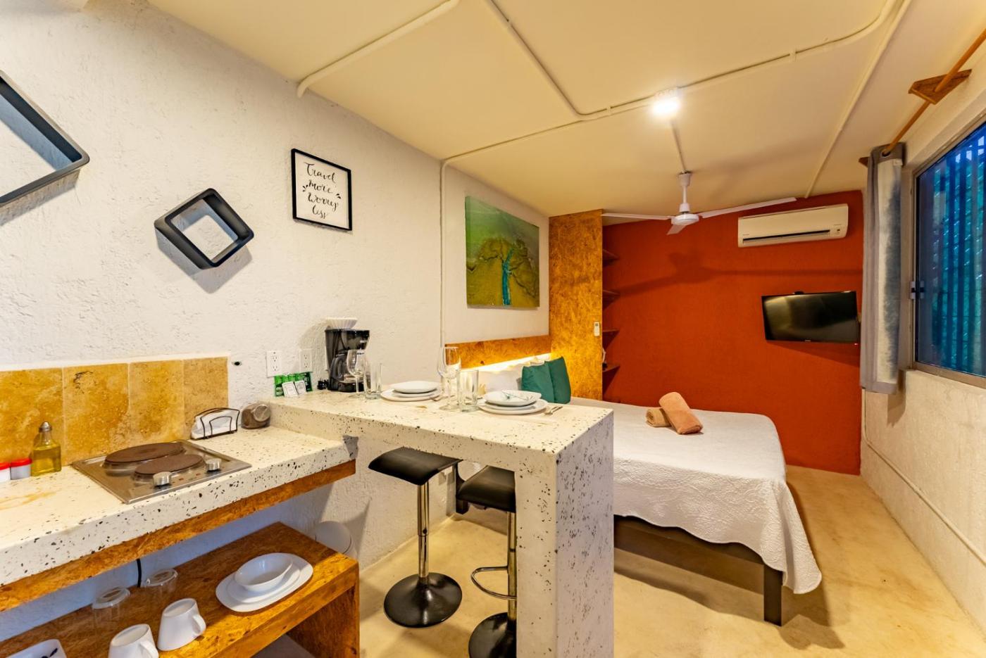 Queen Studio. Guests will find a stovetop, a refrigerator, kitchenware and a microwave in the well-equipped kitchenette. The studio also includes a barbecue. The studio features air conditioning, a private entrance, as well as a private bathroom boasting a walk-in shower and a hairdryer. The unit has 1 bed. ;