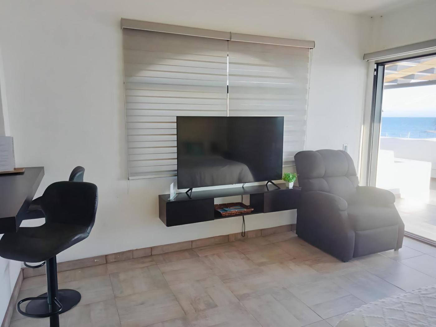 The holiday home features 1 bedroom, 1 bathroom, bed linen, towels, a flat-screen TV with streaming services, a dining area, a fully equipped kitchen, and a terrace with sea views. Guests can take in the views of the mountain from the patio, which also has outdoor furniture. There is also a seating area and a fireplace.